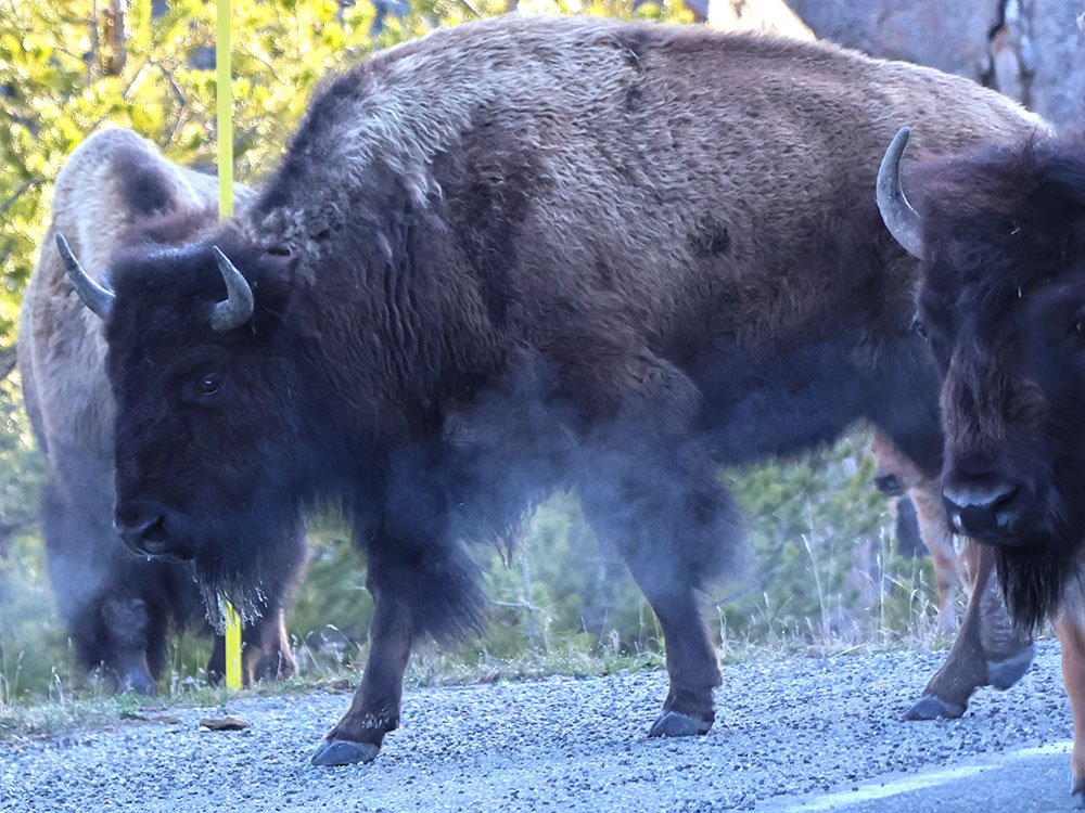 Just a few miles into our drive, we came upon two cars stopped in the road. Curious, we looked ahead and saw the cause: a herd of bison was calmly walking straight down the middle of the road in our direction. Steam rose from their mouths in the cool morning air as they passed just feet from our windows, giving us a look that seemed to say, “Stay put, and we’ll be on our way.” Naturally, we stayed in the car and watched with quiet awe as calves and full-grown bulls made their way past us. It was one of those unforgettable wildlife encounters in Yellowstone that feels both peaceful and powerful.