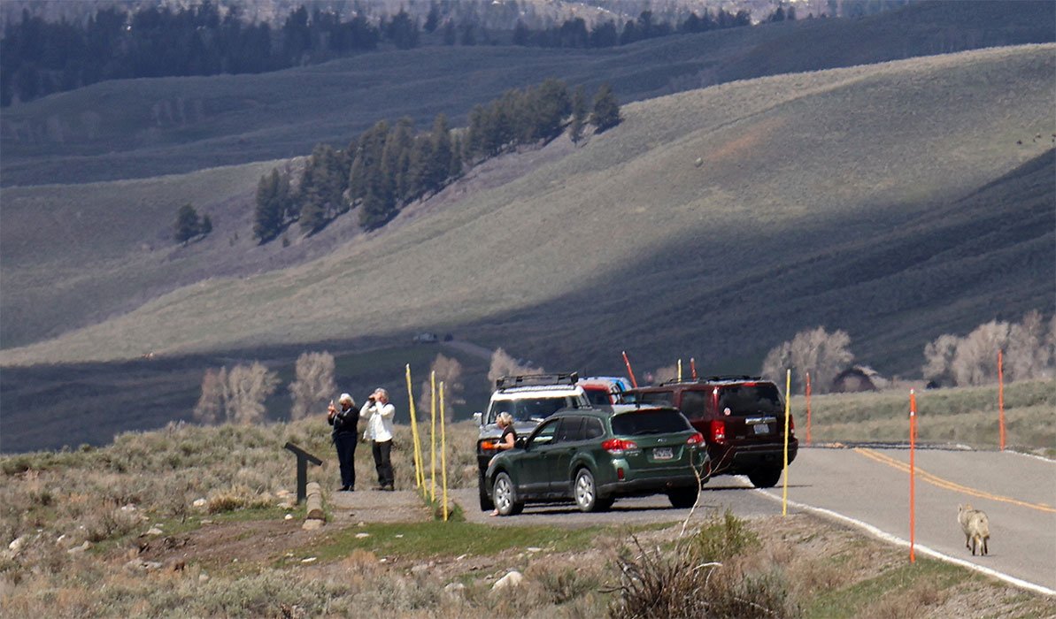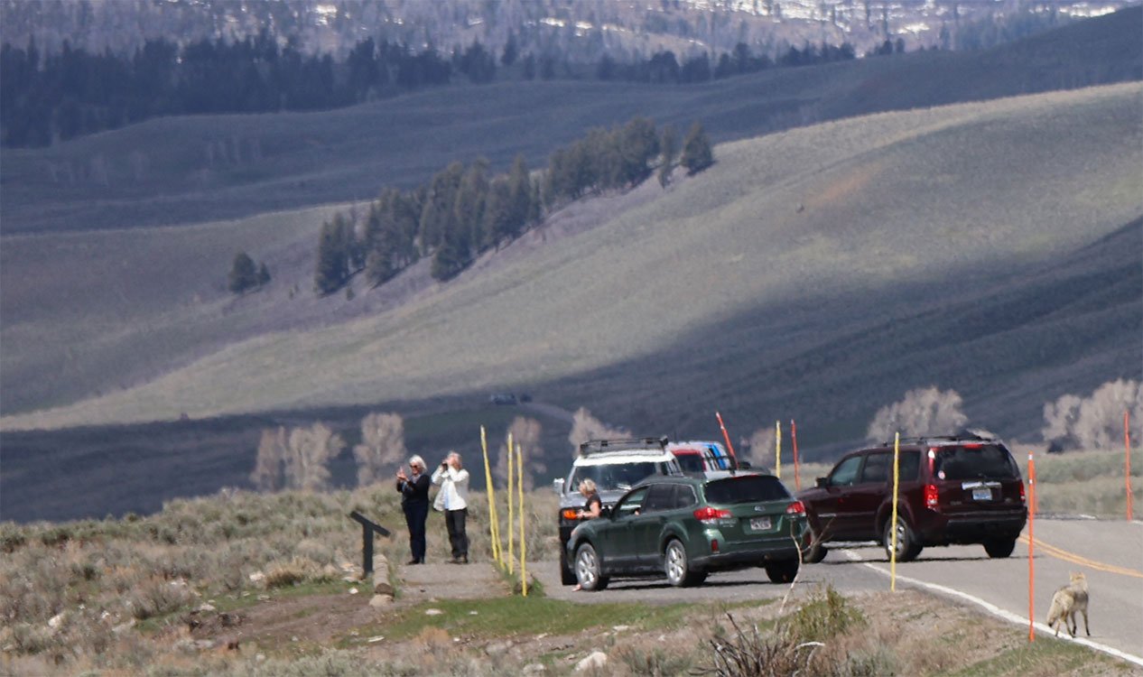 While exploring the Lamar Valley, known as one of the best places to spot wildlife in Yellowstone National Park, we came upon a crowd of cars and photographers gathered along the roadside. Curious, we asked what was going on. They told us a wounded elk had been spotted nearby, and they were waiting for a pack of wolves to appear, cameras ready. It felt a bit too much like the TMZ of wildlife, so we decided to move on. We had already agreed we didn’t want to contribute to an “animal jam.”