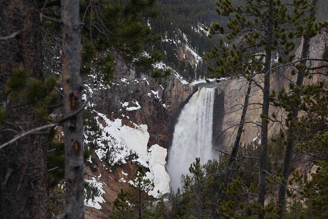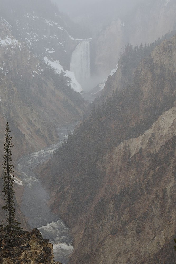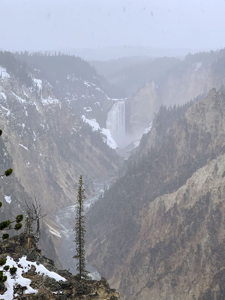 As I began the descent toward the overlook at the top of the Lower Falls of the Yellowstone River, light snow started to fall and it didn’t let up. It snowed steadily for the rest of the afternoon, transforming the landscape into a quiet, white wonderland. The unexpected spring snowfall in Yellowstone added a nice touch to an already unforgettable day of exploration.