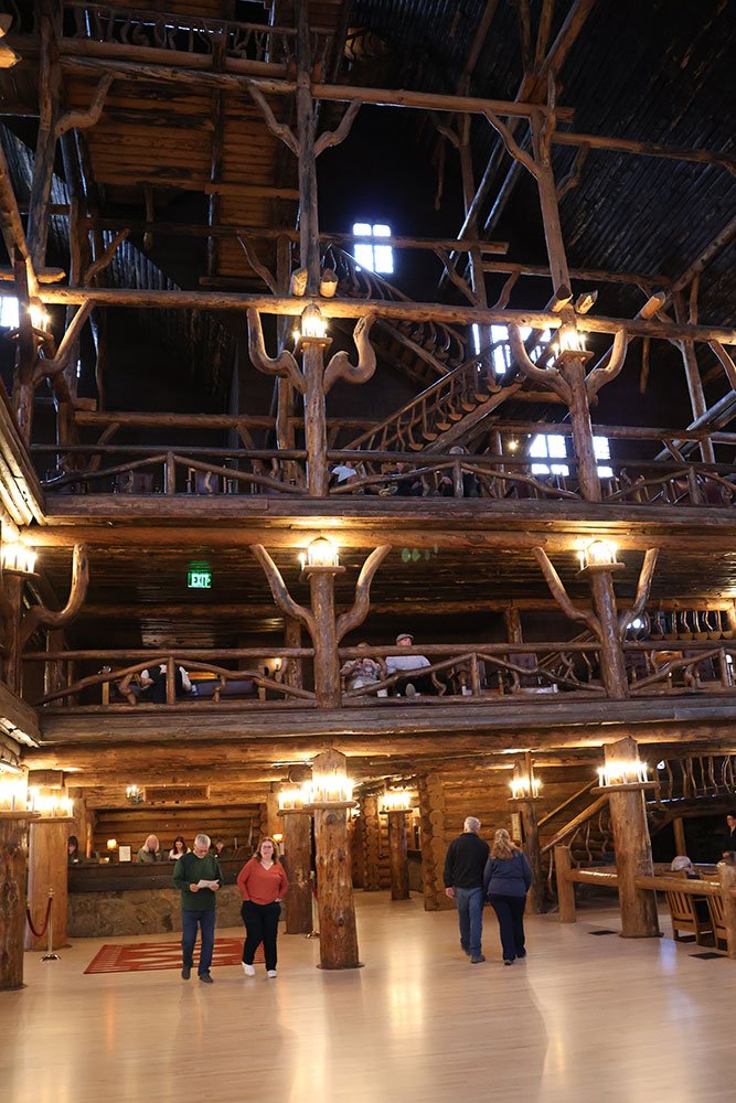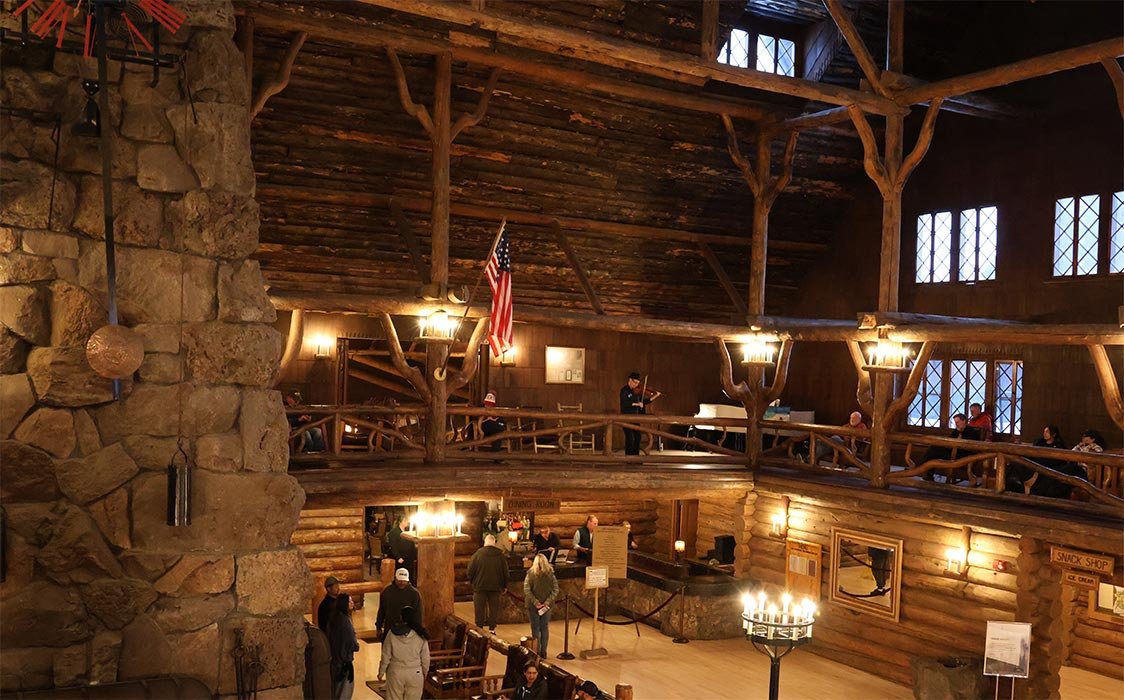 As we stepped inside the historic Old Faithful Inn, we were greeted by its grand rustic architecture and the warmth of the wood interior. To top it off, a man played a fiddle from the balcony, filling the lodge with the perfect soundtrack for stepping back in time. It was a uniquely Yellowstone moment that made this visit extra special, even though we weren’t staying there.