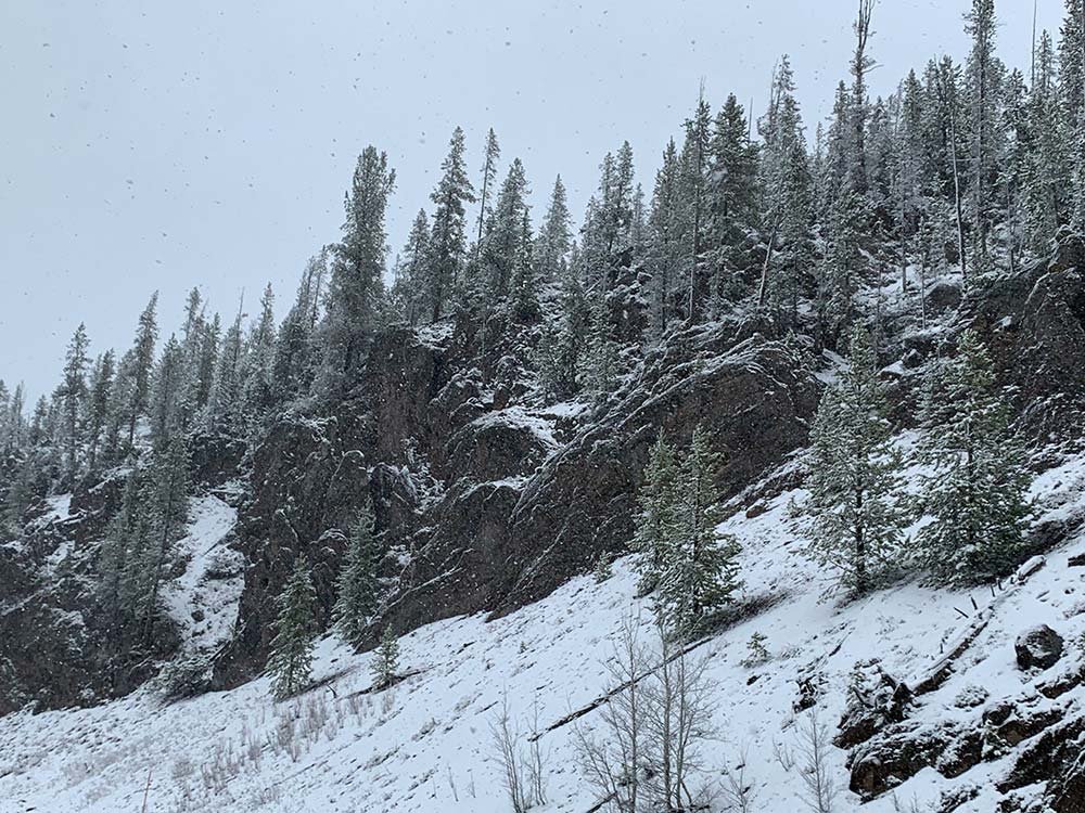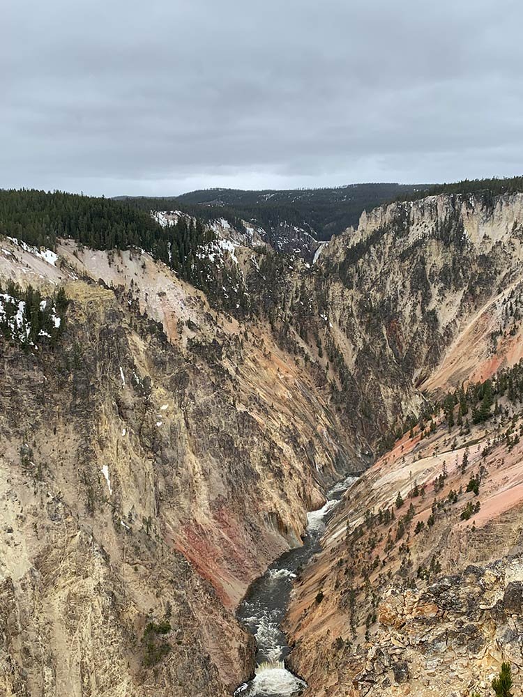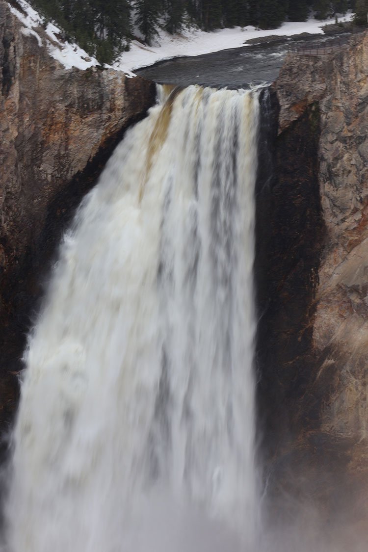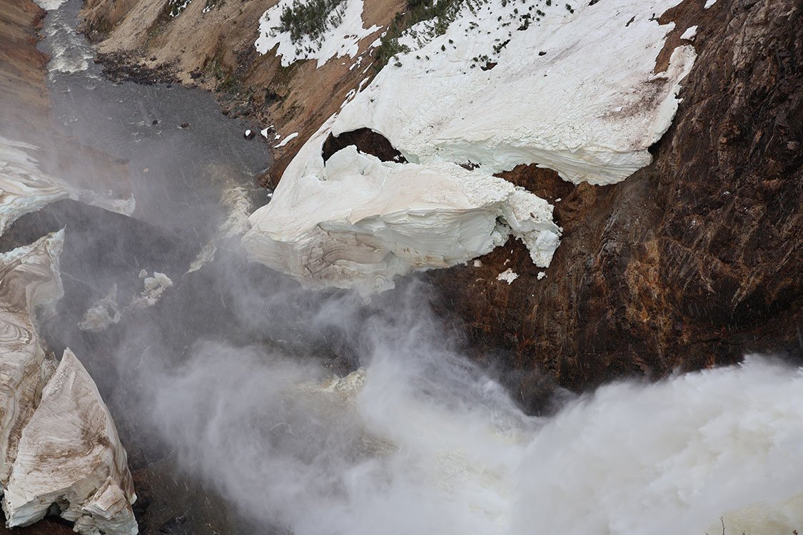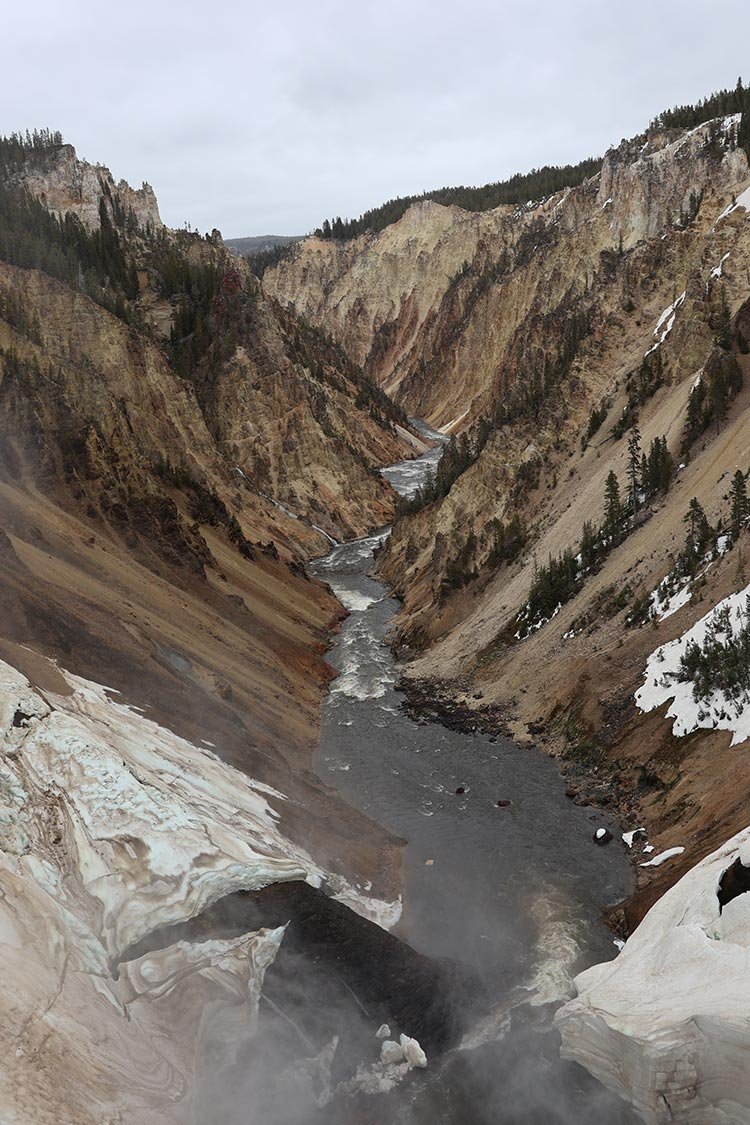 As I began the descent toward the overlook at the top of the Lower Falls of the Yellowstone River, light snow started to fall and it didn’t let up. It snowed steadily for the rest of the afternoon, transforming the landscape into a quiet, white wonderland. The unexpected spring snowfall in Yellowstone added a nice touch to an already unforgettable day of exploration.